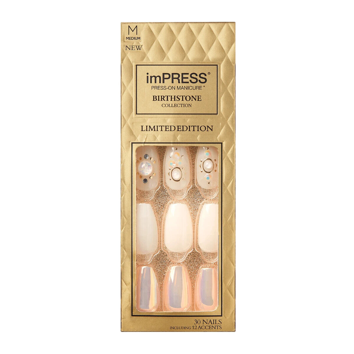 KISS IMPRESS PRESS ON NAILS ONE STEP MANICURE NEW BIRTHSTONE OPAL MEDIUM LENGTH