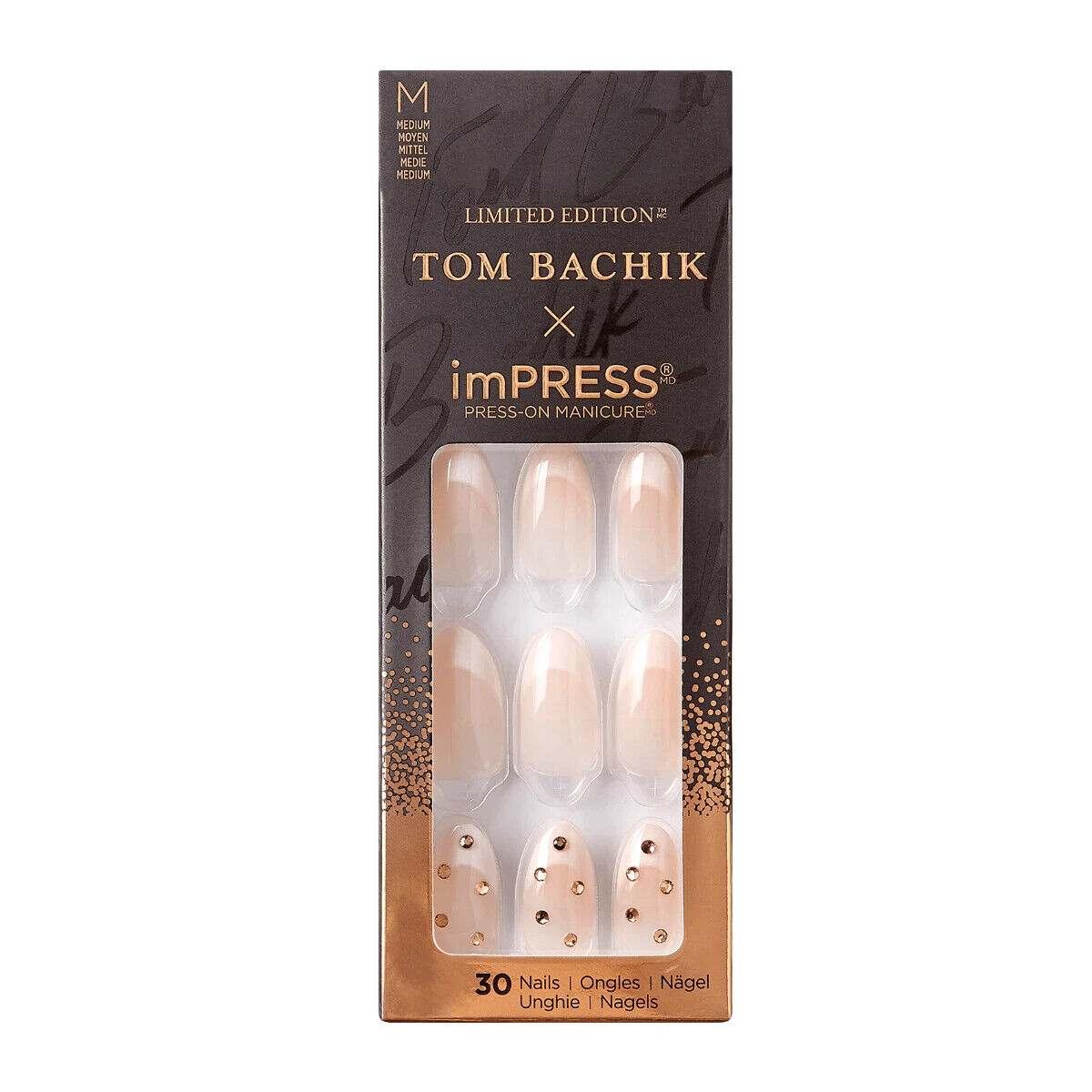 KISS TOM BACHIK x imPRESS Press-On Manicure Nail Kit Style """"You Fancy Huh"""" Medium Almond Neutral Press-On Nails Includes Prep Pad Mini Nail