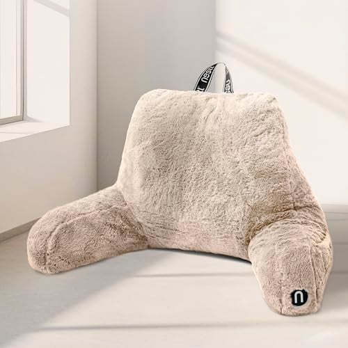 Nestl Fur Reading Pillow, Stylish Back Pillow for Bed Sitting Up, Faux Fur Bed Chair Pillow with Arms, Reading Pillows for Sitting in Bed Adult & Kids, Sit Up Back Support Pillow for Bed Rest - Linen
