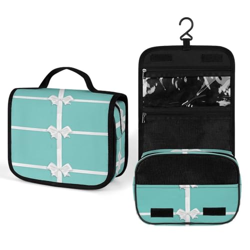 Women Hanging Toiletry Wash bag, Travel Cosmetic Bag, Makeup Organizer Brush Case, Storage with Hook 8.9x7.3 in Print White Satin Bow with Ribbon on Turquoise Blue Background