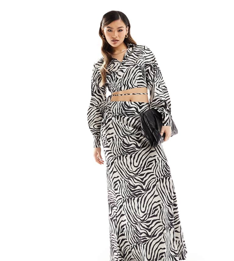 In The Style Womens exclusive satin fishtail maxi skirt co-ord in zebra-Black - White - Size 8 UK