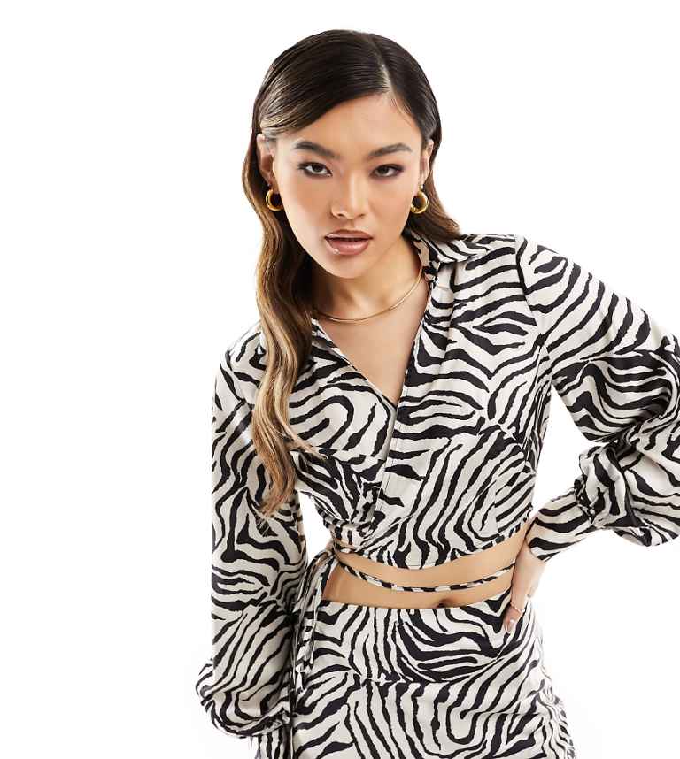 In The Style Womens exclusive satin tie waist shirt co-ord in zebra-Black - White - Size 8 UK