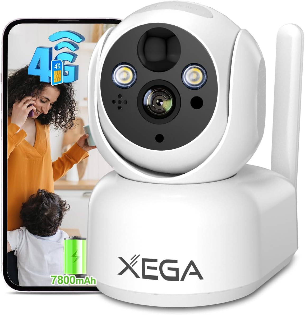 Xega 4G CCTV Indoor Security Camera Wireless-7800mAh Battery, 2K Super HD PTZ Camera with SIM Card, No WiFi, PIR Motion Detection, Color Night Vision, Cloud & TF Card Storage, IP65