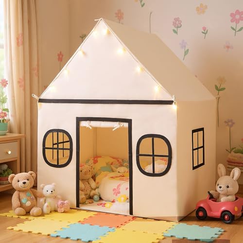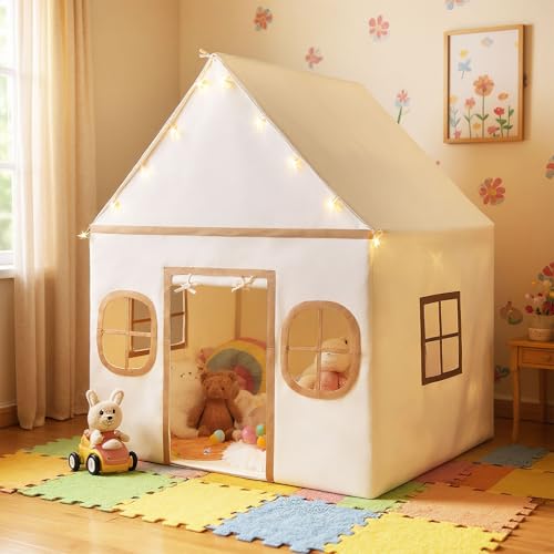 Kids Play Tent, Large Playhouse with Washable Mat Star Lights Flags Windows Storage Pockets, Indoor Outdoor Princess Tents Castle Toys for Toddlers Children Boys Girls (Beige)