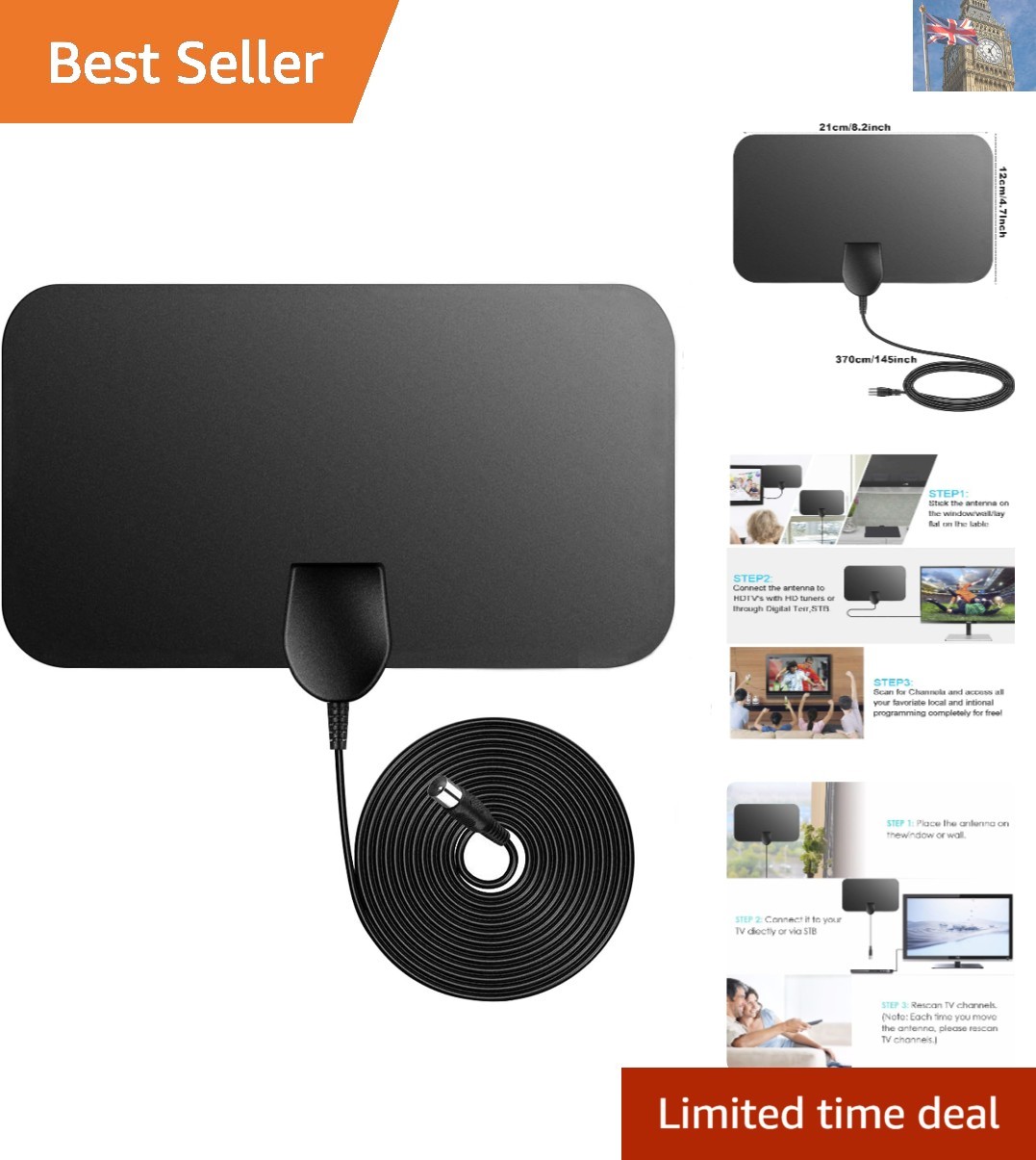2025 Upgraded Indoor TV Aerial - High Gain Freeview HD 300+ Miles Long Range