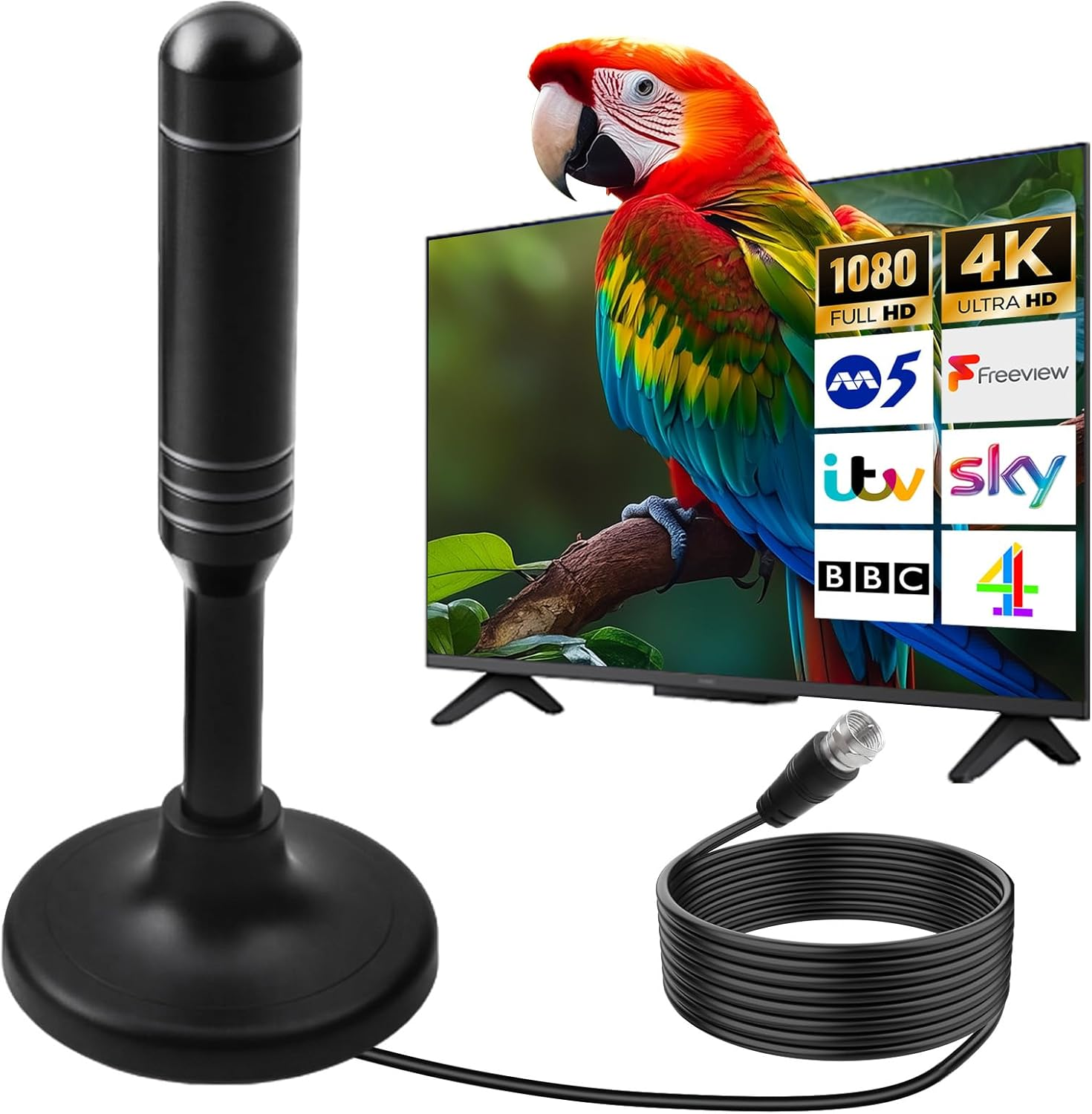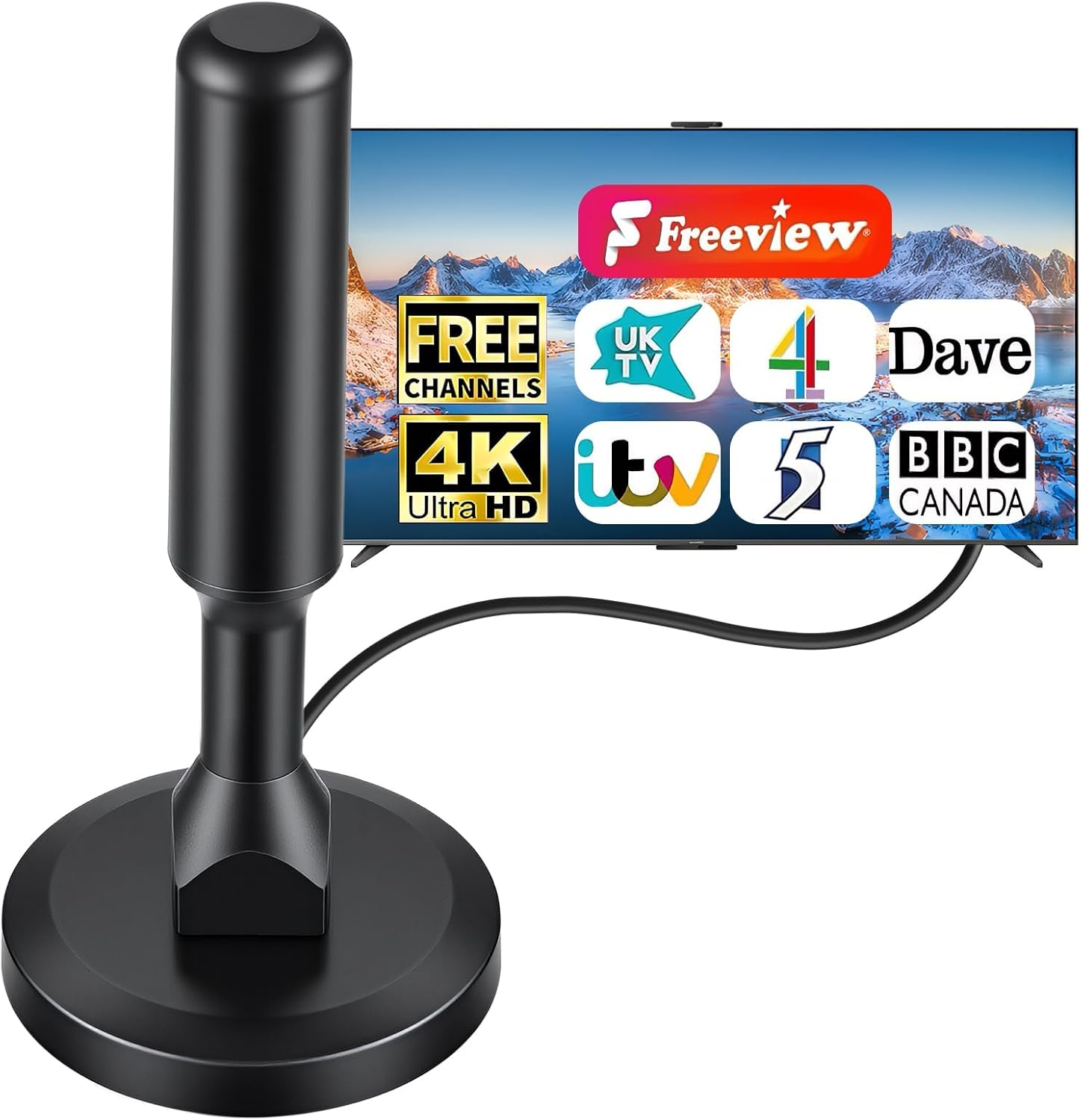 2026 Indoor TV Aerial-Freeview Aerial with 360° Signal Reception, Magnetic Base,Long Range Digital Antenna with 3M Coaxial Cable -Supports 4K/Full HD Freeview TV
