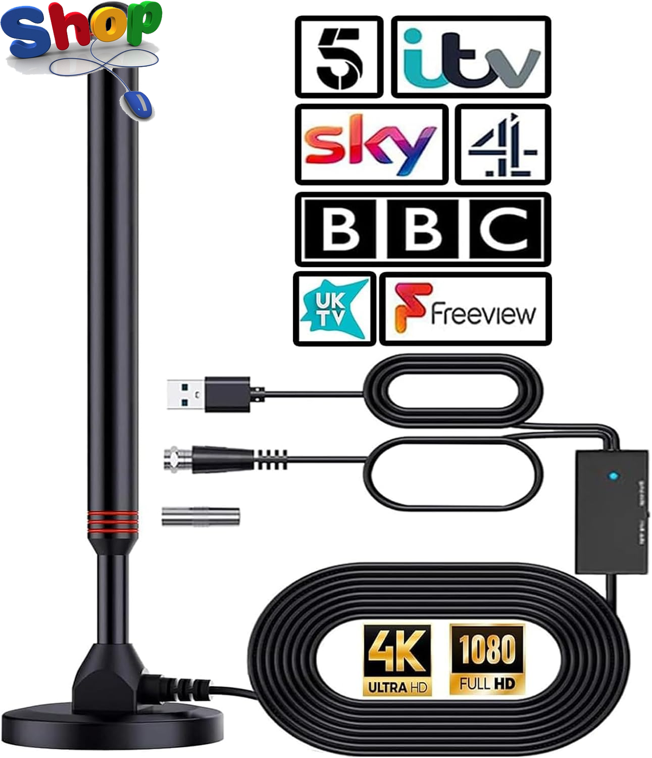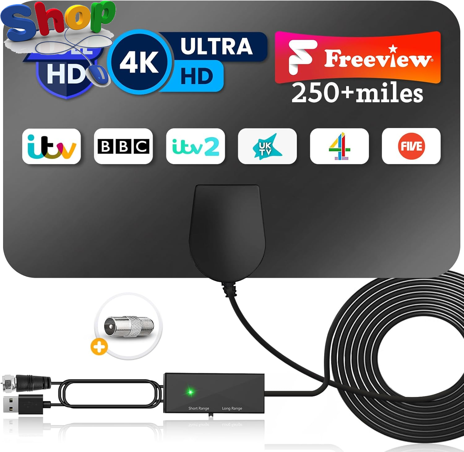TV Aerial Amplifier Signal Booster for Digital Freeview – Boosts Weak Signals for Indoor TV Aerial, Compatible with Smart TVs – USB Powered, 1M USB Cable + 0.3M TV Lead