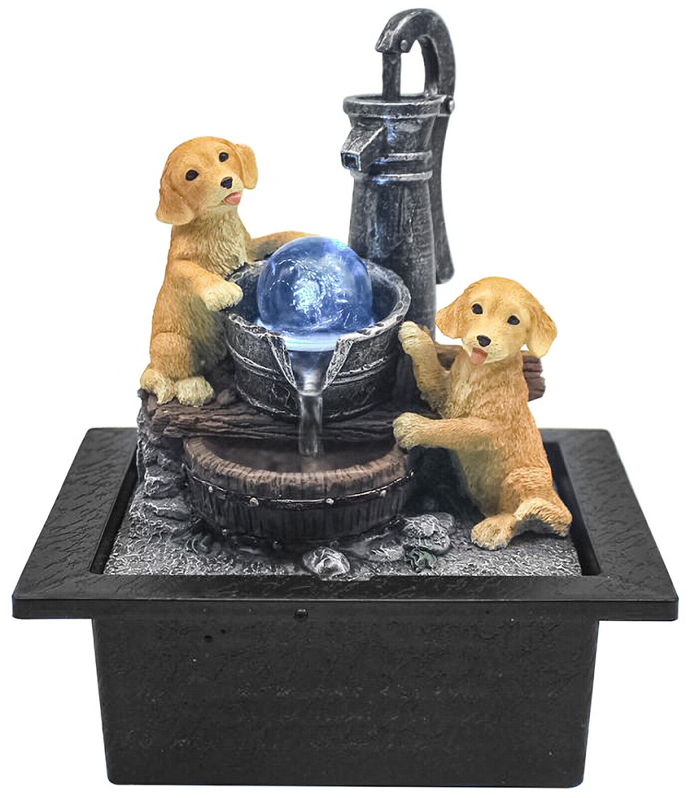 Indoor Water Fountain LED Light Up Waterfall Puppies Water Feature Sculpture