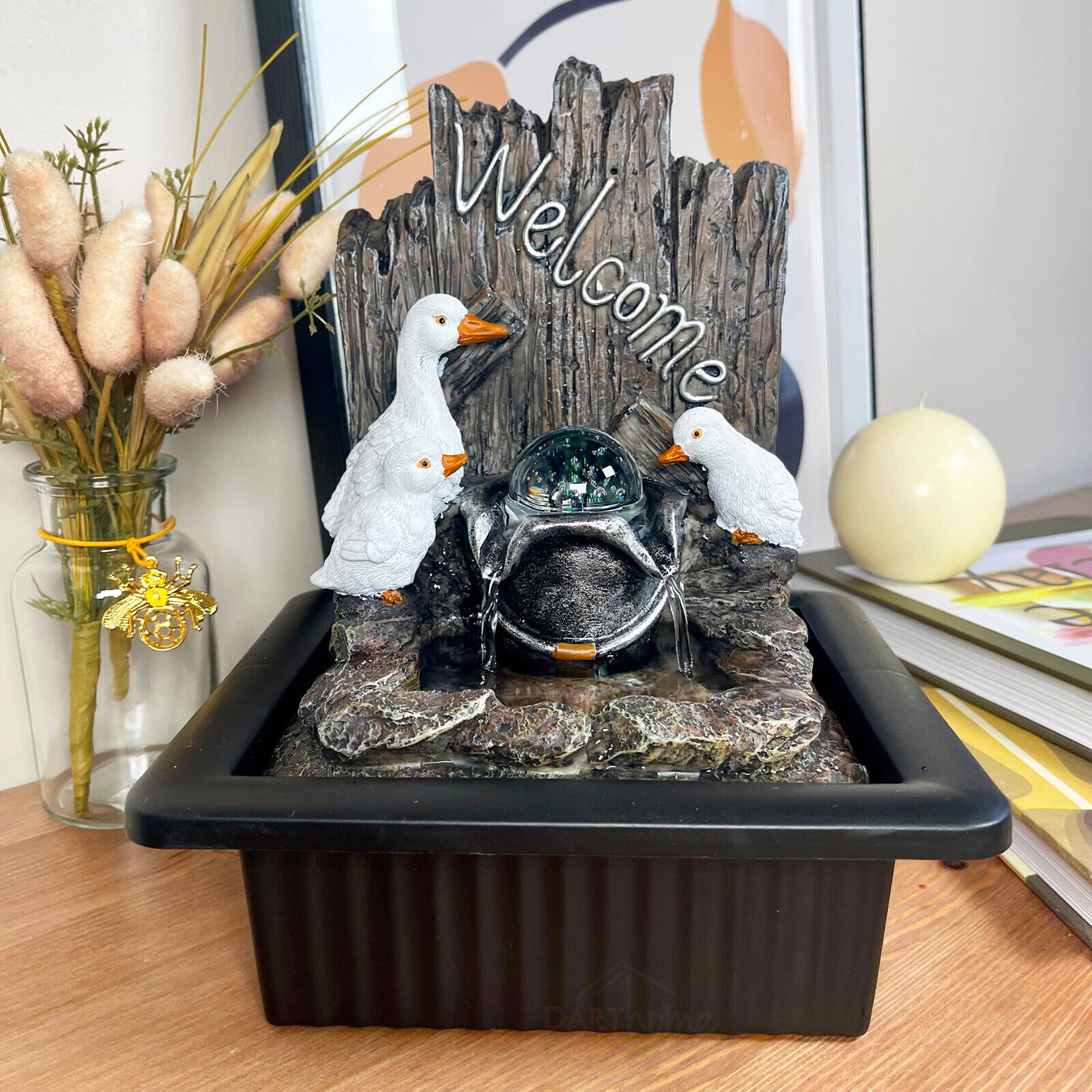 Indoor Water Fountain Welcome Duck Family Tap Flowing LED Light Square Base Gift
