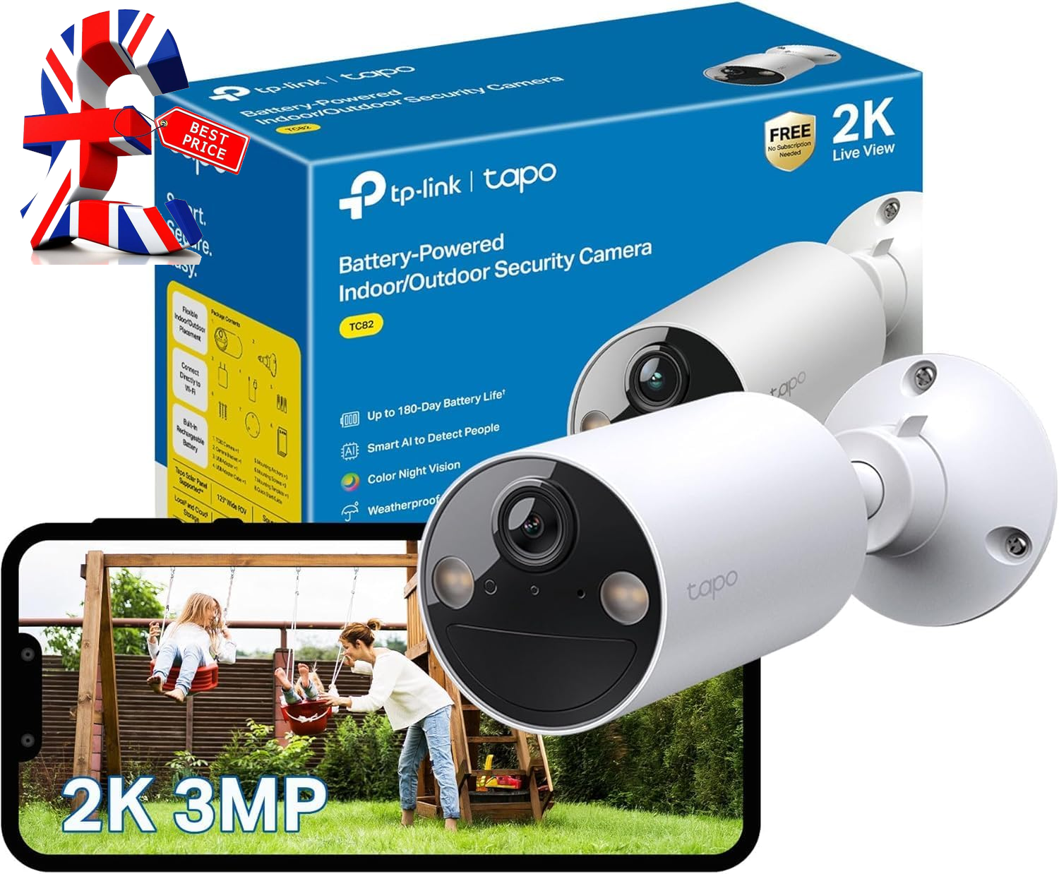 Tapo TC82 2K Battery Security Camera Outdoor Wireless, Indoor & Outdoor CCTV Camera, Colour Night Vision, No Monthly Fee, AI Detection, IP65, 180-Day Battery Life, Works with Alexa & Google