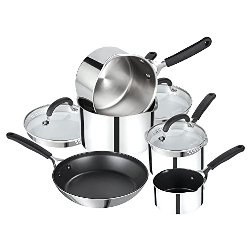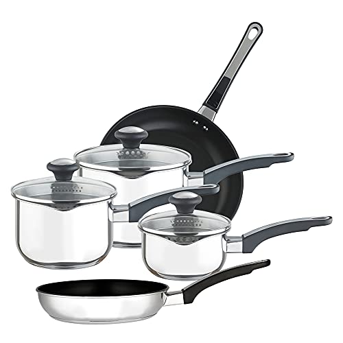 Prestige Stainless Steel Non Stick Pots and Pans Set of 5 - Suitable as Induction Hob Pan Set with Straining Lids & Pouring Lips, Dishwasher Safe, Oven Safe, Durable Cookware, Black/Silver
