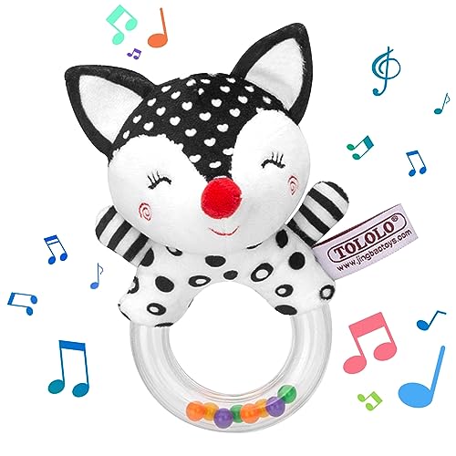 Wolepaz Baby Rattles 0-6 Months, Black and White Soft Rattles Plush Animal Toys, Elephant/Fox Plush Rings Infant First Hand Grip Toys(Rubber Ring Fox), 265-2B