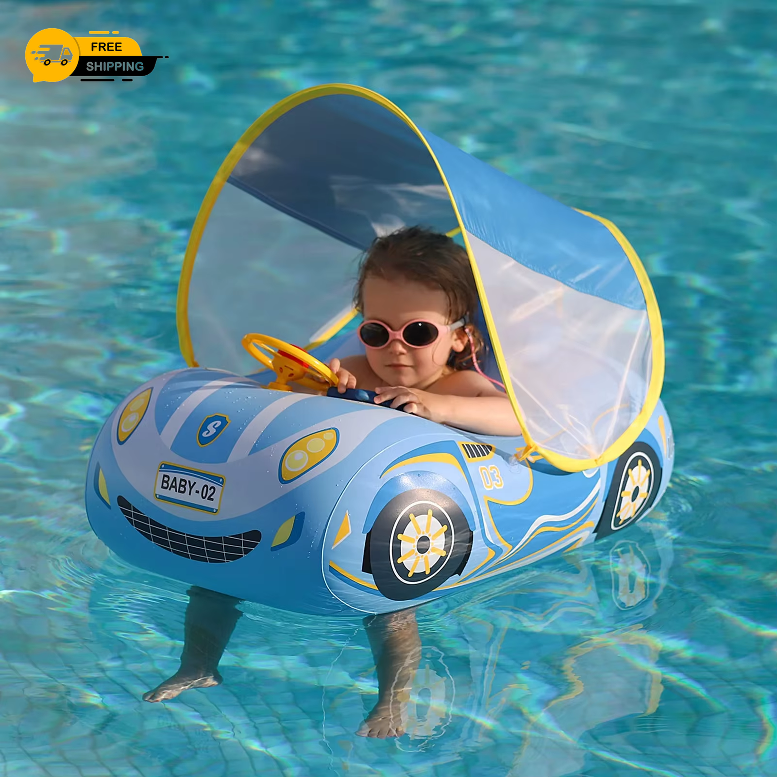 Swimbobo Toddler Pool Float Inflatable Car Baby Swim Float with Adjustable Sun Canopy and Safety Seat Pool Toys for Kids 3 Years Old + (Blue Sports Car)