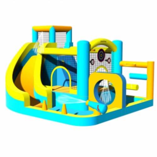 Inflatable Bouncy Castle Water Park with Slide, Sprayer, Trampoline, Splash Pool, Climbing Wall & Basketball Hoop, Includes Air Blower, Outdoor Bounce House for Kids & Toddlers, Holds Up to 5 Children