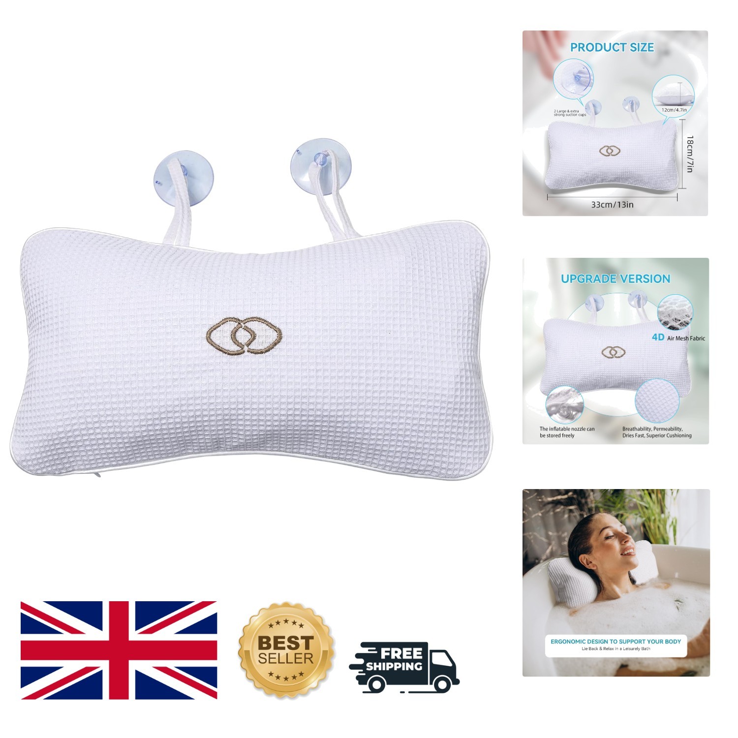 Inflatable Spa Bath Pillow with Suction Cups for Neck and Back Comfort - White