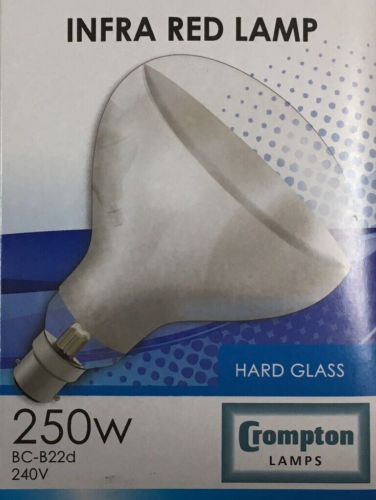 Infra Red 250 Watt BC Crompton Hard Glass 250W clear Bayonet B22 Heat Lamp