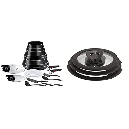 Tefal Ingenio Easy ON Pots & Pans Set, 20 Pieces, Stackable, Removable Handle, Space Saving, Non-Stick, Black, L1599402 & Ingenio L9931012 3 Piece Glass lids, 16-cm, 18-cm, 20-cm , Black