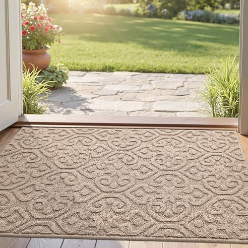 DEXI Door Mat Inside Entrance 24x36, Ultra Non Slip Rubber Backed Dirt Trapper, Low Profile Thin Welcome Doormat, Absorbent Easy Clean Entry Mats for Entryway, Patio, Beige