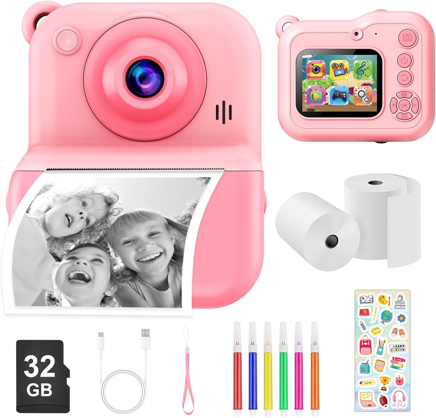 Kids Camera Instant Print,1080P Digital Instant Camera for Kids, 32GB Card, 3 Ro