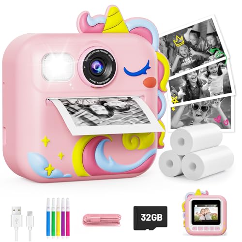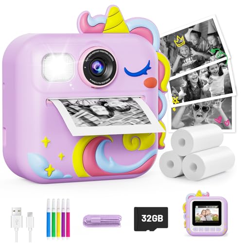 Hangrui Kids Camera Instant Print, HD Instant Camera for Kids with 32GB Card & Print Paper, 14MP 1080P Kids' Digital Cameras, Christmas Birthday Gifts Toy for Girls & Boys Aged 3-10 -Unicarn