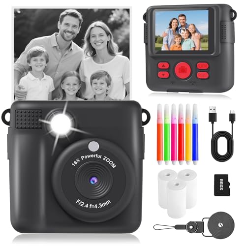CAMCLID Kids Camera Instant Print, 3,0 Inch/48MP Instant Camera for Kids, 2.5K UHD Digital Video with 32GB Card, Christmas Birthday Toy Gifts for Girls Boys 3 4 5 6 7 8 9 10 Years Old (Black)