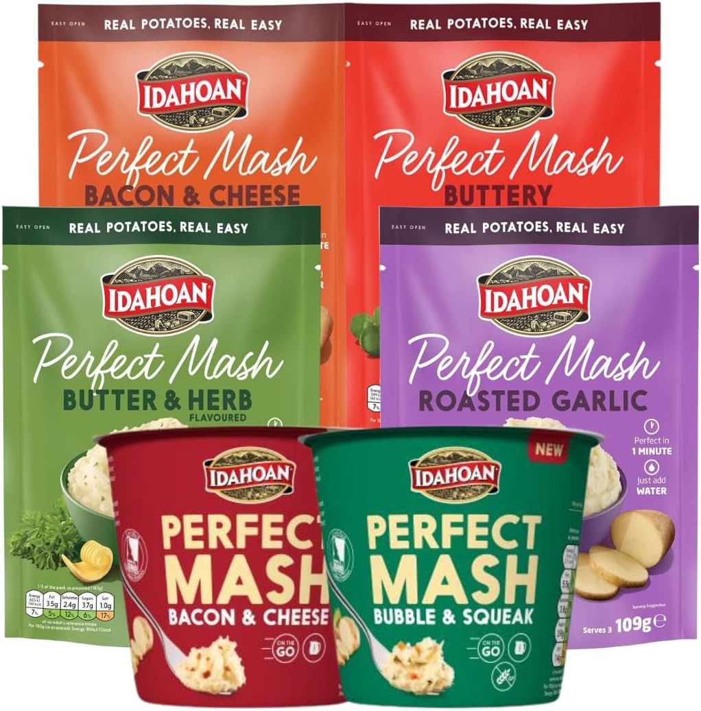 Idahoan Perfect Mash Potato Variety Pack of 8 x 109g - Instant Mashed Potato Family Pack Butter & Herb, Buttery, Bacon & Cheese, Roasted Garlic, Ched