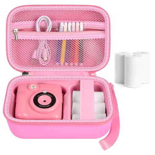 Kids Instant Print Camera Case for Hangrui for HiMont for Luoba Digital Cameras with 3 Rolls Paper Refill, Toddler Cameras Storage Bag with Strap& Mesh Pocket for Thermal Paper (Box Only) (Pink)