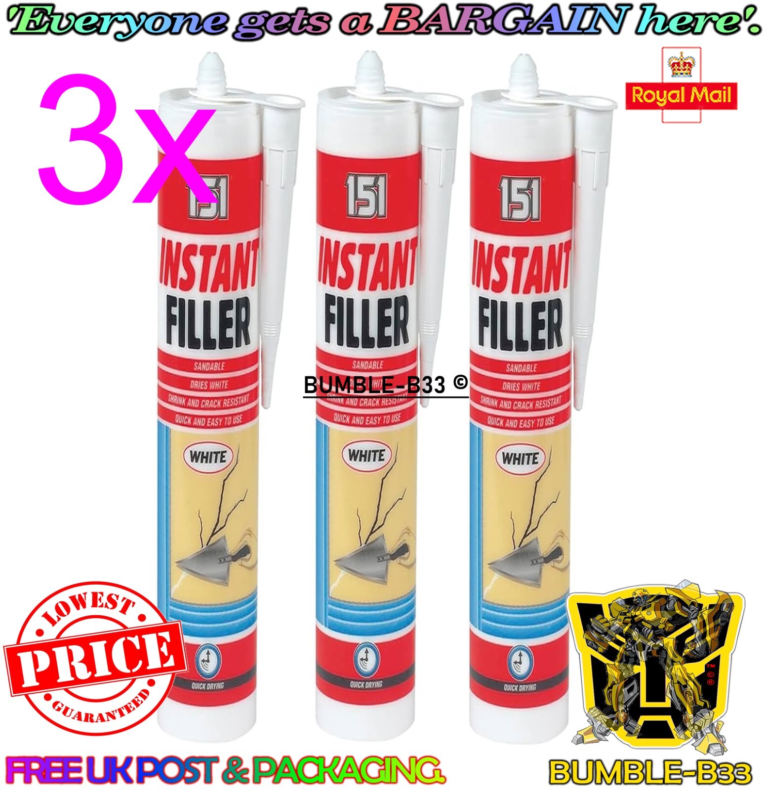3x 151 Instant Wall Filler Crack Resistant Cartridge Dries White Sandable