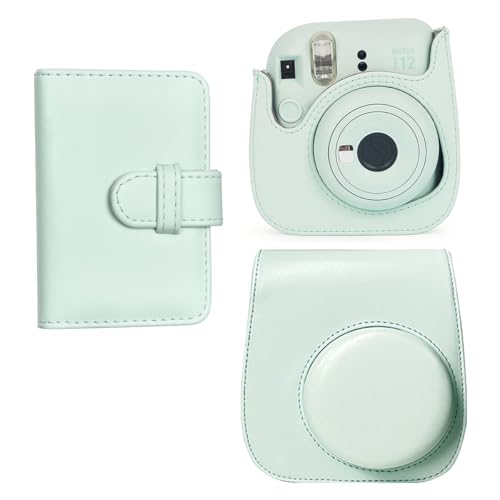 HIYQIN Elegant Case and Album for Fujifilm Instax Mini 12, Protective Leather Case Carry Bag with Photo Pocket, Key-Chain Photo Album and Shoulder Strap - Mint Green