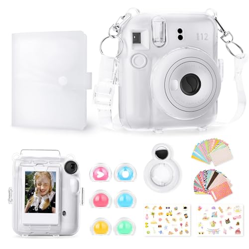 Rieibi Accessories for Fujifilm Instax Mini 12, Gift Bundle Includes Clear Instax Mini 12 Case with Strap, Mini Photo Album, Selfie Mirror, DIY Stickers, Color Filter (No Camera) - White