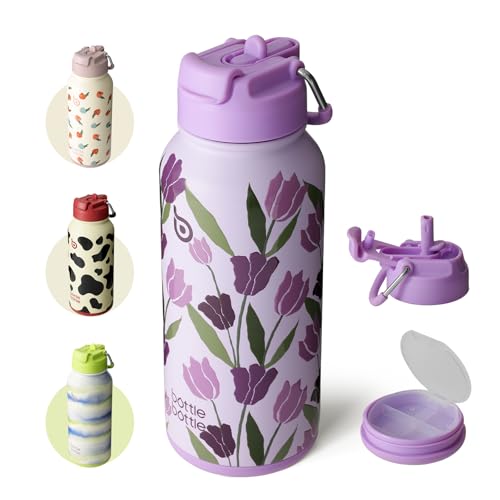 BOTTLE BOTTLE Insulated Water Bottle 950ml(32oz) Stainless Steel Sports Water Bottles with Straw Dual-use Lid Drink Flask Design for Gym with Pill Box (purple tulips)
