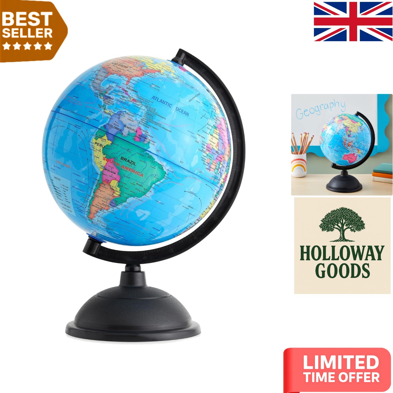 32CM Educational World Globe with Weighted Base, Classroom Decorative Large Earth for Students & Geography Teachers, 360° Rotating Interactive Globe with World Map-Learning Tool& Educational Toys