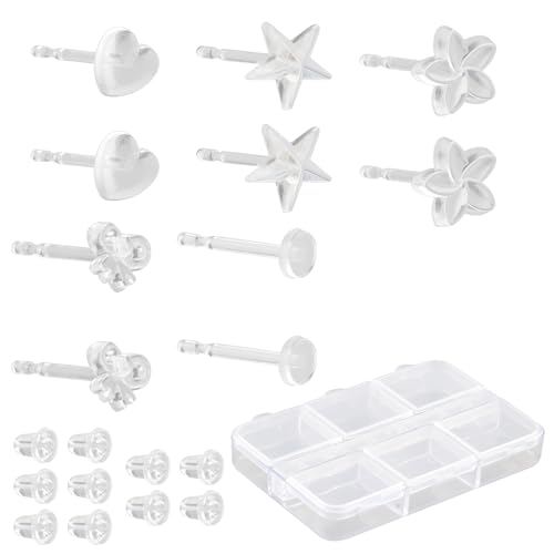 EUPSIIU 12 Pairs Plastic Star Heart Post Stud Earrings - Hypoallergenic, Invisible, Clear Studs for Sensitive Ears