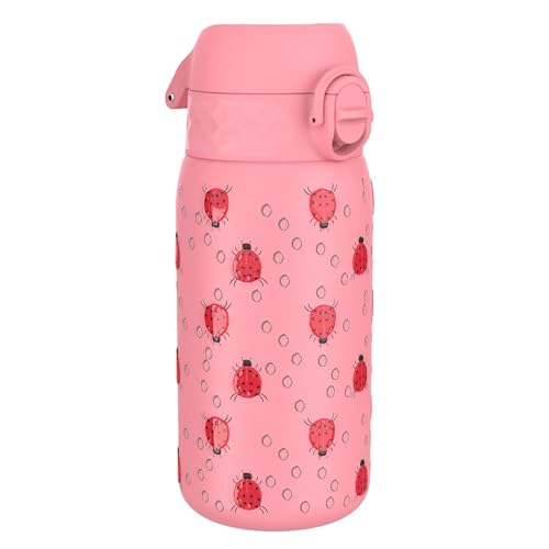 Ion8 Vacuum Insulated Steel Water Bottle, 320 ml/11 oz, Leak Proof, Easy to Open, Secure Lock, Dishwasher Safe, Carry Handle, Metal Water Bottle, ThermoShield Stainless Steel, Pink, Lady Bugs