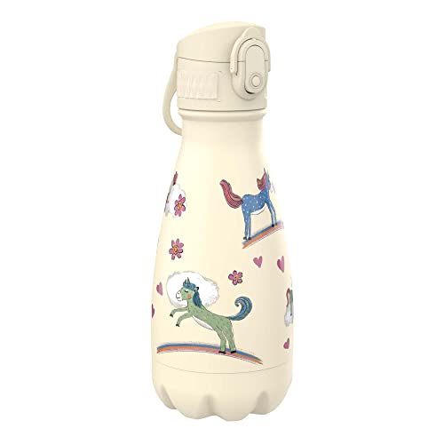 Ion8 Insulated Steel Water Bottle, 320 ml/11 oz, Leak Proof, Easy to Open, Secure Lock, Dishwasher Safe, Carry Handle, Flip Cover, Metal Water Bottle, Raised Print, Stainless Steel, Pink Unicorns
