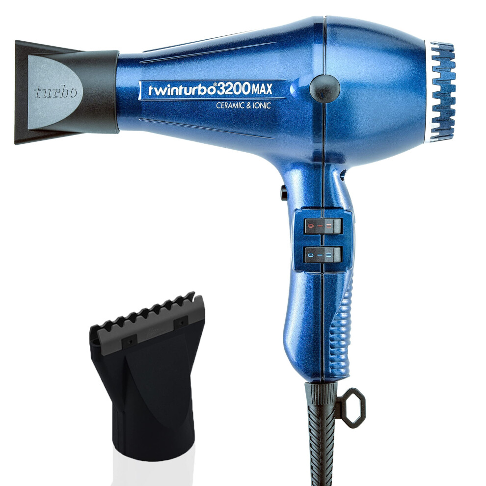 Turbo Power Twin Turbo 3200 MAX Ceramic & Ionic Night Blue Hair Dryer and M Hair Designs Hot Blow Attachment Black (Bundle 2 Items)