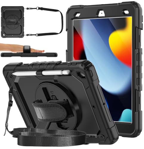 DAORANGE Case for iPad 9th/8th/7th Generation 10.2 Inch, Shockproof Case with Screen Protector, 360° Rotating Stand/Hand Strap & Shoulder Strap and Pencil Holder for iPad 9/8/7 (Black)