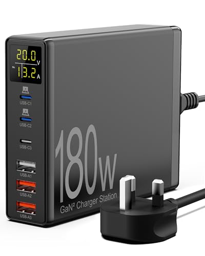 Sanicata 180W 6-Port USB C Charging Station With LCD Display, GaN Charger for Multiple Devices, iPad, iPhone, Galaxy, Android - Black