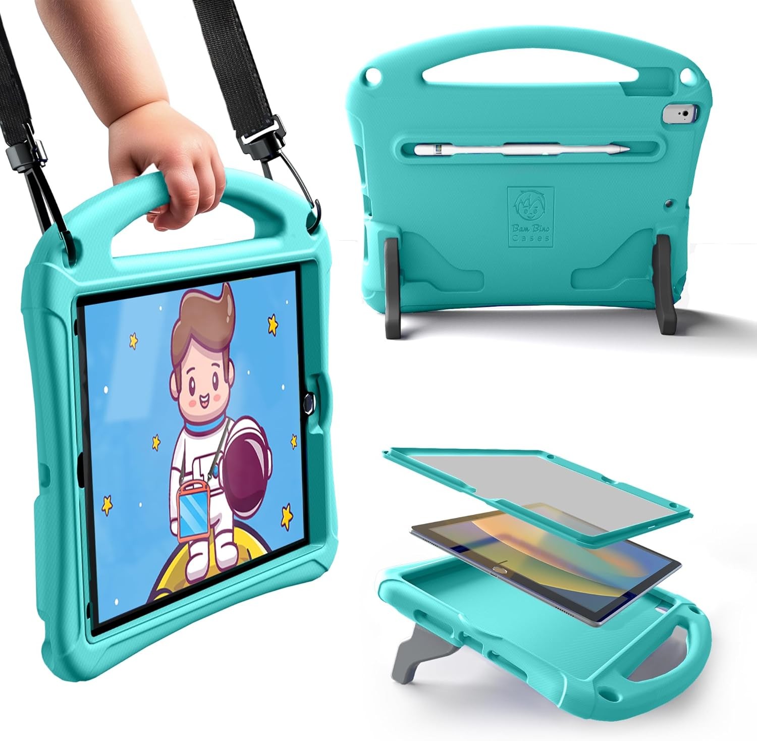 Bam Bino Space Suit iPad 9th Generation Case Kids, iPad 8th/7th (2021/2020/2019) 10.2 inch iPad Case, Lightweight shockproof with Screen Protector, Shoulder Strap, Handle, Stand (Aquatic Turquoise)