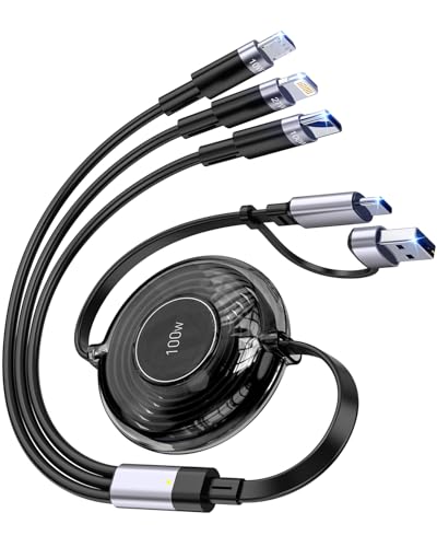 100W 5-in-1 Retractable Charging Cable, Lightn-ing/Micro USB/Type C Multi Charger Cord for iPhones, iPads, MacBook, Tablets, Galaxy, Note & More - 4Ft/1.2M 5A Fast Charging, Durable & Portable, Black