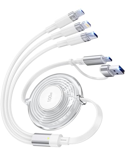 100W 5-in-1 Retractable Charging Cable, Lightn-ing/Micro USB/Type C Multi Charger Cord for iPhones, iPads, MacBook, Tablets, Galaxy, Note & More - 4Ft/1.2M 5A Fast Charging, Durable & Portable, White