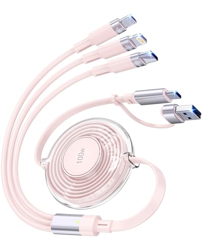 100W 5-in-1 Retractable Charging Cable, Lightn-ing/Micro USB/Type C Multi Charger Cord for iPhones, iPads, MacBook, Tablets, Galaxy, Note & More - 4Ft/1.2M 5A Fast Charging, Durable & Portable, Pink