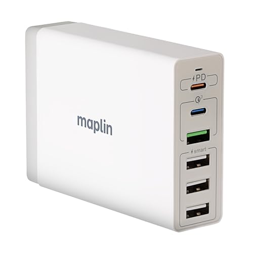 Maplin 6 Port USB Charger 4x USB-A & 2x USB-C 65W 10A High Speed, 1m Cable, for iPhone 15/14/13/12/11/SE/X/XS/XS MAX/XR/8, iPad/Pro/Mini/Air, Samsung, Kindle & more