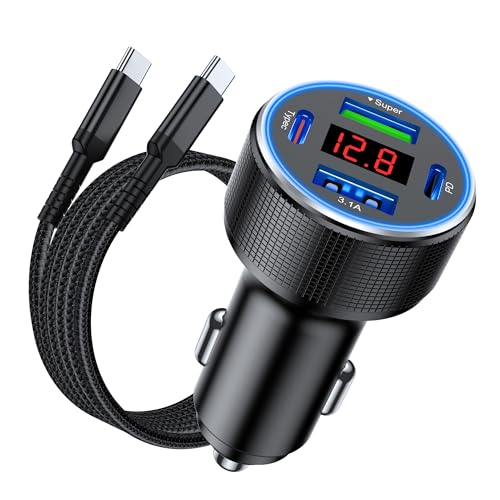 USB C Car Charger With Cable, 78W 4 Port Car Charger Adapter with Voltmeter Car Phone Charger Cigarette Lighter USB Charger Fast Charging for iPhone 16/15/14/13/12, Samsung Galaxy, iPad