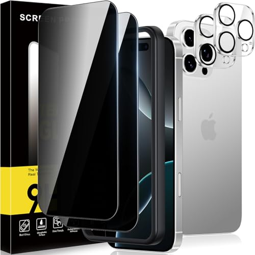 Rainway for iPhone 16 Pro max Screen Protector Privacy, 2+2 Pack Anti-Spy Tempered Glass films+Camera Lens Protector, Anti-Glare, Anti-Fingerprint, 9H Tempered Glass Film with Easy Installation Tool
