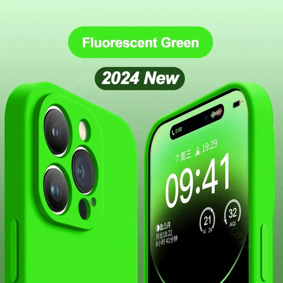 (Fluorescent Green, For iphone 16 ProMax) Liquid Soft Silicone Phone Case For iPhone 16 15 14 11 12 13 Pro Max Plus Protection Shockproof Bumper Back