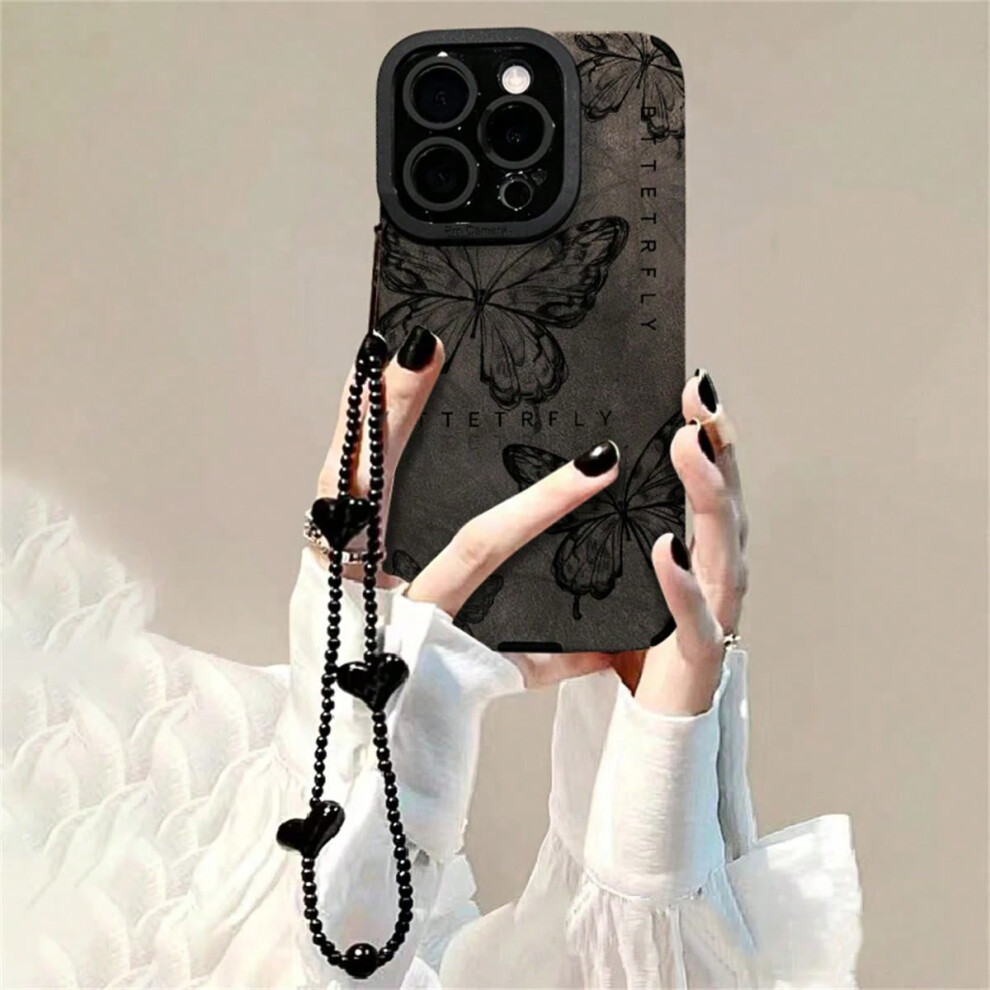 (Black, for iphone 16ProMax) Korean Cute Wave Black Butterfly Love Heart Hang Chain Soft Case For iPhone 16 15 14 Pro Max 12 13 11 X XS XR 8 Plus Clea