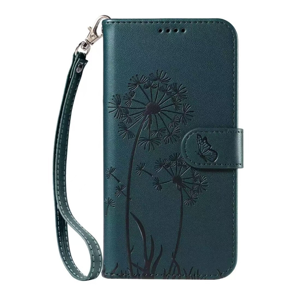 (dark green, iPhone 16PROMAX) Suitable for iPhone16Pro embossed dandelion mobile phone leather case Apple 14 flip cover bracket card protection case S