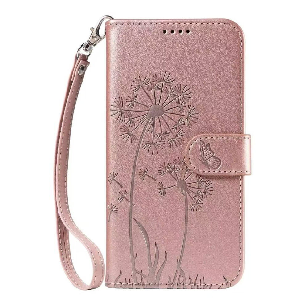 (Rose gold, iPhone 16PROMAX) Suitable for iPhone16Pro embossed dandelion mobile phone leather case Apple 14 flip cover bracket card protection case SE