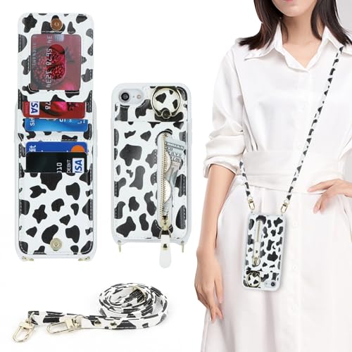 Zouzt for iPhone SE 2022/2020/3rd/2rd / iPhone 8/7 4.7 Inch Case with Cord and Card Holde, Zipper Wallet Case with Crossbody Lanyard Ring Adjustable Necklace Protective Cover Women - Cow Print Black
